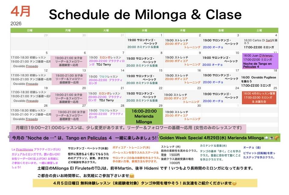 ミロンガ開催 2026年4月のミロンガ開催のスケジュール