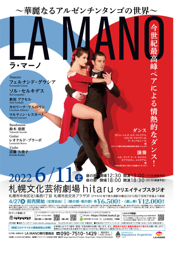 LA MANO (ラ・マーノ) はスペイン語で「手」を意味します。 この度、 アルゼンチンタンゴの世界において 最高峰ペアと称されるフェルナンド・グラシアとソル・セルキデスを中心に、 世界で活躍してきた才能 あふれるダンサーと演奏家達が、 手と手を取り合い最高の舞台を北海道の皆様にお届けします。 フェルナンドとソルは数々の賞を世界で受賞してきており、中でも芸術性の高い振付とパフォーマンス が評価され、2018年にはCITA (アルゼンチンタンゴ国際会議)において最優秀振付賞を受賞しています。 今回、彼らのパフォーマンスを待望していたファンのためにも、彼らの代表作を全てご覧いただけるよう、 2公演開催と致しました。 会場設営は本場アルゼンチンさながらのステージ四方囲みの配席とし、観客の 皆様が舞台のパフォーマンスをより身近に、臨場感あふれる形でご観覧頂けるようにこだわりました。 またとない夢のようなこの舞台を多くの皆様に存分にお楽しみいただきたいと思います。